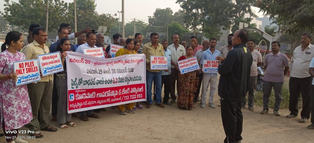 ప్రజలు ఫైల్స్ వ్యాధి పట్ల అవగాహన పెంచుకోవాలని కూరపాటి ఆసుపత్రి చైర్మన్ డాక్టర్ కూరపాటి రమేష్ అన్నారు. గురువారం ప్రపంచ ఫైల్స్ దినోత్సవం పురస్కరించుకొని హుజూరాబాద్ ప్రభుత్వ ఉన్నత పాఠశాల మైదానంలో మార్నింగ్ వాకర్స్ కు ఫైల్స్ వ్యాధి పట్ల అవగాహన కల్పించారు. ఫైల్స్ వ్యాధి పట్ల అవగాహన కోసం ర్యాలీ నిర్వహించి అనంతరం పోస్టర్ ఆవిష్కరించారు. ఈ సందర్భంగా ఆయన మాట్లాడుతూ… ఆహారపు అలవాట్ల మూలంగా మలబద్ధకం ఏర్పడుతుందని, అనంతరం ఫైల్స్ ఏర్పడతాయన్నారు. ఫైల్స్ వ్యాధి వచ్చినవారు నిర్భయంగా నిస్సక్కోచంగా డాక్టర్లను సంప్రదించాలని, సిగ్గు, బిడియంతో తమ బాధను చెప్పుకోకపోవడం వల్ల అవి పెరిగి ఇబ్బందికరమైన పరిస్థితి వస్తుందన్నారు. ఫైల్స్ వ్యాధి ఉన్న ఎవరైనా వైద్యుని సలహా మేరకు మందులు వాడాలన్నారు. ఈ కార్యక్రమంలో ఐఎంఏ నాయకులు డాక్టర్ రామలింగారెడ్డి, క్యాస ఉపేందర్, ఆడెపు సూర్యం, వాకర్స్ అసోసియేషన్ అధ్యక్షులు హరిప్రసాద్, వేల్పుల రత్నం , ఈశ్వర్ రెడ్డి, మార్త రవి , సతీష్ సారయ్య, దేవిక తదితరులు పాల్గొన్నారు.