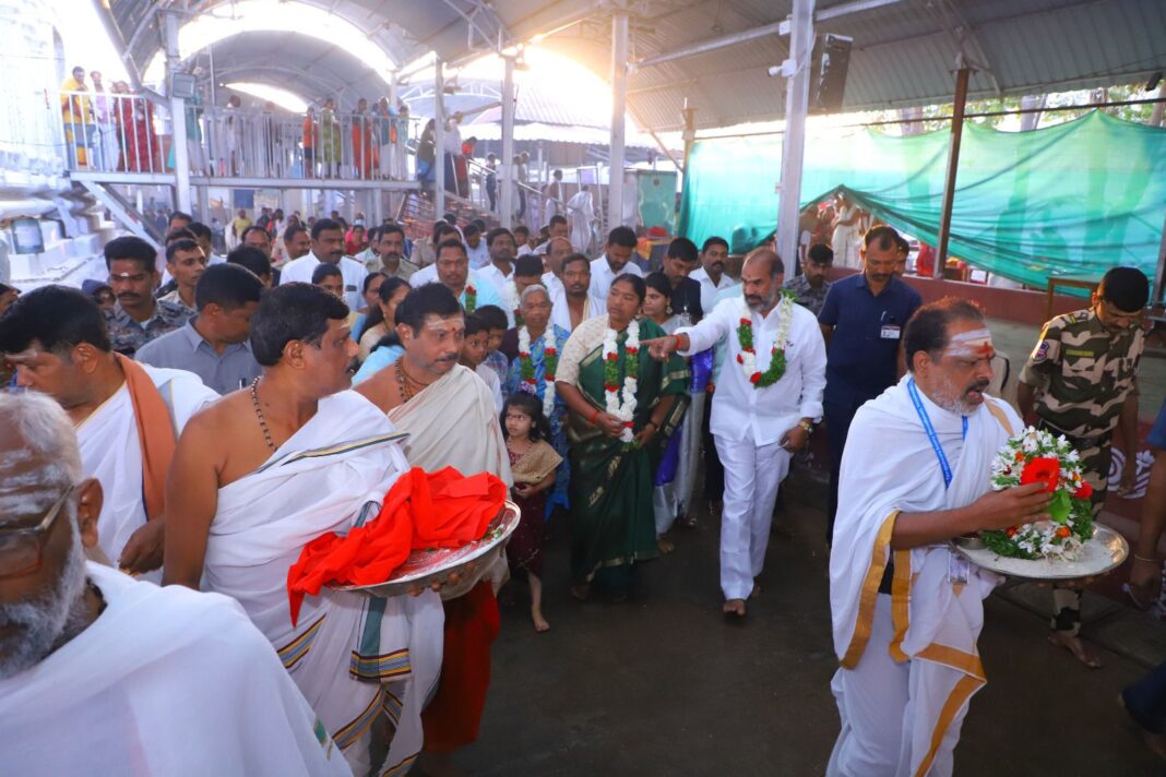 వేములవాడ పట్టణంలోని శ్రీ భీమేశ్వర స్వామి ఆలయంలో మంత్రి సీతక్క శుక్రవారం ప్రత్యేక పూజలు చేశారు. మంత్రి సీతక్క ఆలయానికి రాగా, ప్రభుత్వ విప్, వేములవాడ ఎమ్మెల్యే ఆది శ్రీనివాస్ పుష్పగుచ్చం అందజేసి స్వాగతం పలికారు.ఈ సందర్భంగా ఆలయంలో అర్చకులు, అధికారులు మంత్రికి పూర్ణకుంభంతో స్వాగతం పలికారు. ముందుగా కోడె మొక్కు చెల్లించుకొని, భీమేశ్వర స్వామి ఆలయం లో మంత్రి ప్రత్యేక పూజలు చేశారు. గాయత్రి మాతను దర్శించుకున్నారు. ఆలయ అర్చకులు, అధికారులు మంత్రికి స్వామి వారి ప్రసాదం అందజేసి, వేదోక్త ఆశీర్వచనం అందజేశారు.